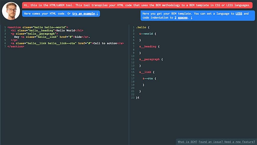 You only need to copy your HTML component and paste it in the left hand side text editor in the tool. Immediately, you will get a CSS template in the right hand side text editor. You can even choose whether the template should be generated in the CSS or LESS language and set code indentation as well. Keep in mind that top-level html element must contain a block class name to get the template. Enjoy!