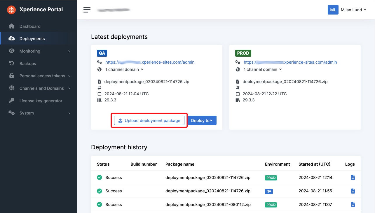 4. Go to Xperience Portal > Deployments and upload the package file to start the deployment.