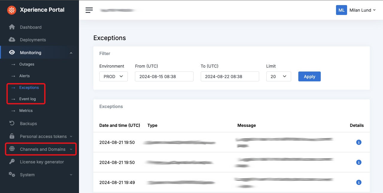 Before going live, I recommend checking the Monitoring section in the Xperience Portal, specifically the Exceptions and Event log. These sections will highlight potential issues with your project. The Event log is mirrored from the Event Log application in your Xperience by Kentico Admin, and issues caught by Application Insights may also appear here.